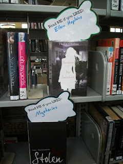 I saw this idea for a display....somewhere. A long time ago. I've been doing it with little slips of paper, which fall out of the books all the time. I finally got it together, printed out, colored, cut out, laminated, and cut out again 15 speech bubbles (ok, actually a volunteer and staff member cut out most of them, but you know). Then I discovered that they were TOO BIG and the tails aren't long enough to stick in the books. Also, the grammarian in me realized they make more sense if they say "like" and not "liked" because I often do genres and things, not just specific books and movies.