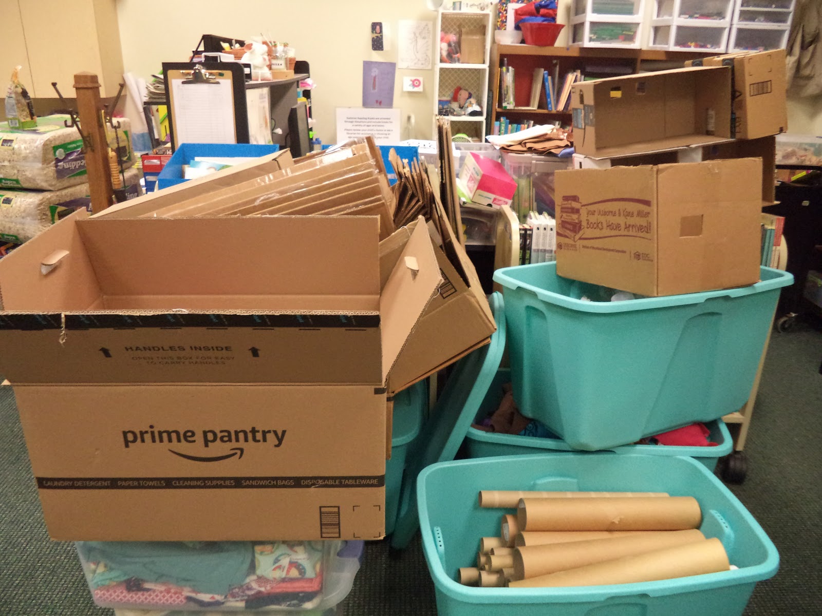 | My office, glimpsed dimly in the distance, after Tuesday's cardboard program and before we put the spoils away |